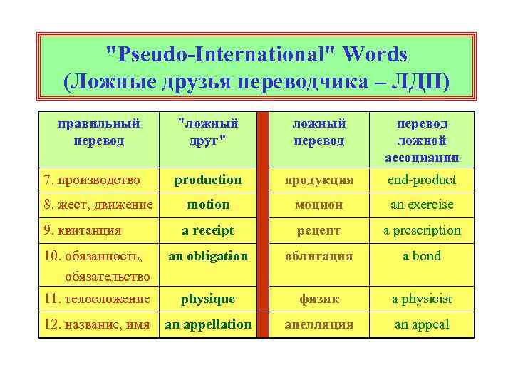 "Pseudo-International" Words (Ложные друзья переводчика – ЛДП) правильный перевод "ложный друг" ложный перевод ложной ассоциации 7. производство production продукция end-product motion моцион an exercise a receipt рецепт a prescription 10. обязанность, обязательство an obligation облигация a bond 11. телосложение physique физик a physicist 12. название, имя an appellation апелляция an appeal 8. жест, движение 9. квитанция