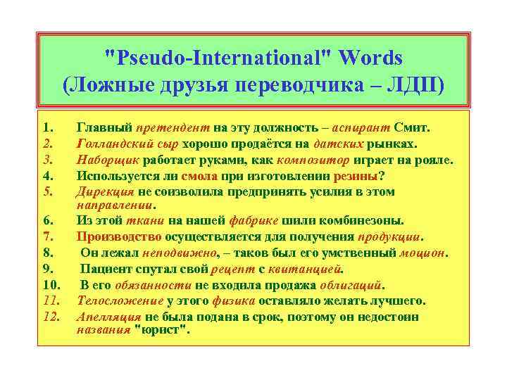 "Pseudo-International" Words (Ложные друзья переводчика – ЛДП) 1. 2. 3. 4. 5. 6. 7. 8. 9. 10. 11. 12. Главный претендент на эту должность – аспирант Смит. Голландский сыр хорошо продаётся на датских рынках. Наборщик работает руками, как композитор играет на рояле. Используется ли смола при изготовлении резины? Дирекция не соизволила предпринять усилия в этом направлении. Из этой ткани на нашей фабрике шили комбинезоны. Производство осуществляется для получения продукции. Он лежал неподвижно, – таков был его умственный моцион. Пациент спутал свой рецепт с квитанцией. В его обязанности не входила продажа облигаций. Телосложение у этого физика оставляло желать лучшего. Апелляция не была подана в срок, поэтому он недостоин названия "юрист".
