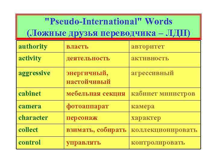 "Pseudo-International" Words (Ложные друзья переводчика – ЛДП) authority власть авторитет activity деятельность активность aggressive энергичный, настойчивый агрессивный cabinet мебельная секция кабинет министров camera фотоаппарат камера character персонаж характер collect взимать, собирать коллекционировать control управлять контролировать