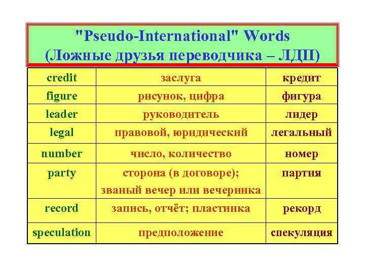 "Pseudo-International" Words (Ложные друзья переводчика – ЛДП) credit figure leader заслуга рисунок, цифра руководитель кредит фигура лидер legal правовой, юридический легальный number число, количество номер party партия record сторона (в договоре); званый вечер или вечеринка запись, отчёт; пластинка speculation предположение спекуляция рекорд