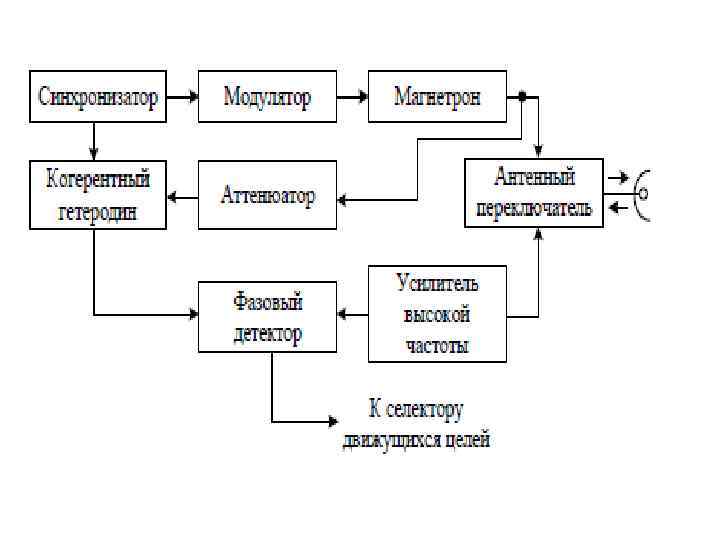 Псевдокогерентные РЛС с внутренней когерентностью • • Излучение. Синхронизатор служит для подачи импульсов запуска всей аппаратуры в одно и тоже время. Модулятор подает питание на магнетрон, он же в свою очередь вырабатывает СВЧ колебания (отрицательный видеоимпульс, т. к. подается на катод). Затем через антенный переключатель (антенно-фидерный тракт) к антенне-излучили. Прием. От антенны к антенному переключателю, а затем через УВЧ, смеситель и УПЧ попадается отраженный сигнал на фазовый детектор. Также с магнетрона на аттенюатор подается тот же сигнал, только с меньшей мощностью. С аттенюатора подается на когерентный гетеродин, чтобы запомнить фазу излученного сигнала. После этого он приходит опять на фазовый детектор. Далее через систему СДЦ и на гребенчатый фильтр подавления (на П-18 вычитающий потенциалоскоп).