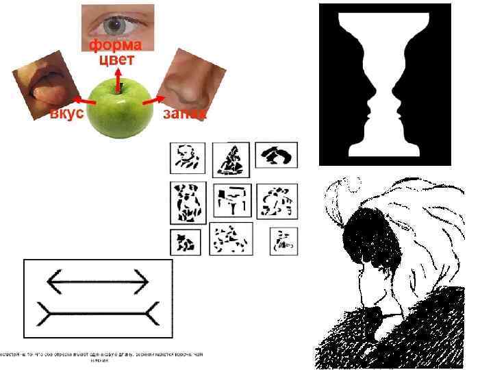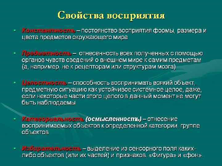 Формы и принципы восприятия Фигура — фон — восприятие выделяет фигуру из фона. Константность — объекты длительное время воспринимаются одинаково. Осмысленность Группировка — однообразные стимулы группируются в структуры. Принципы группировки: Близость — расположенное рядом воспринимается вместе. Подобие — схожее по каким-то признакам воспринимается вместе. Замкнутость — человек склонен заполнять пробелы в фигуре. Целостность — человек склонен видеть непрерывные формы, а не сложные комбинации. Смежность — близкое во времени и пространстве воспринимается как одно. Общая зона — стимулы, выявленные в одной зоне воспринимаются как группа.