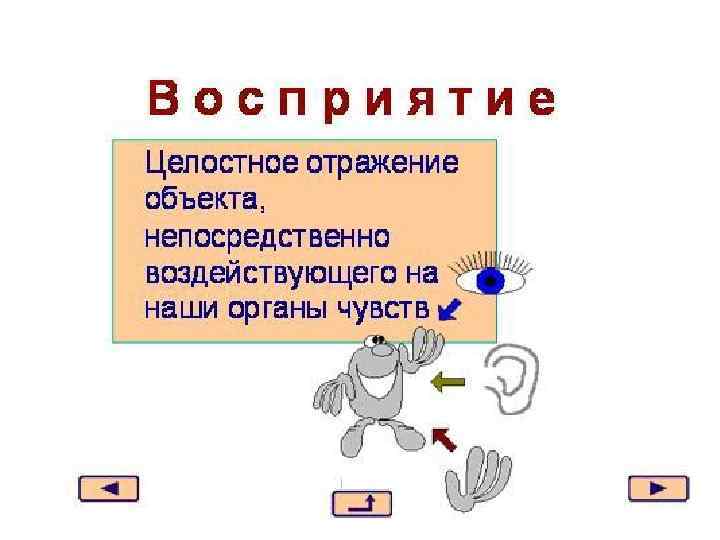 Восприятие (перцепция) Восприятие - психический процесс формирования образа предметов и явлений внешнего мира. В отличие от ощущений, которые отражают только отдельные свойства и качества предметов, восприятие целостно и предметно. Метафорически можно сказать, что восприятие - это свернутое мышление.