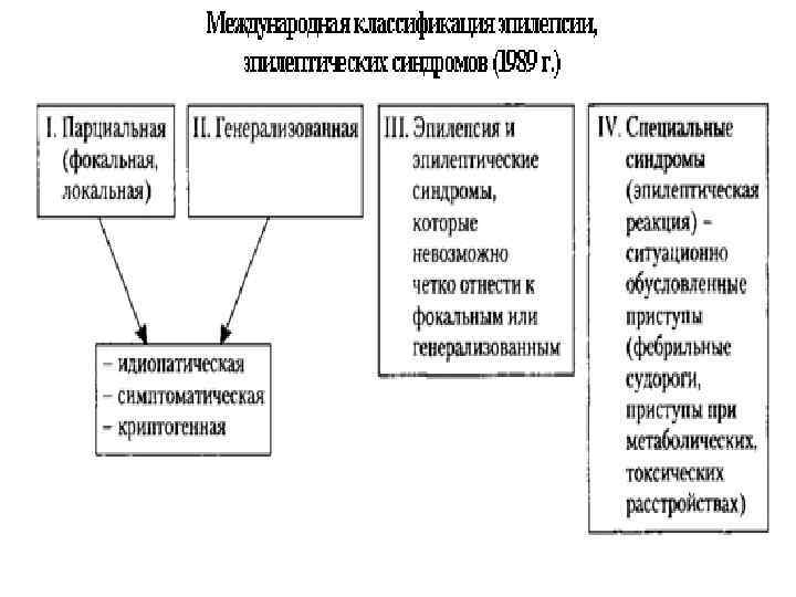 Международная классификация эпилептических пароксизмов (ILAE, 1981): I. Парциальные (фокальные, локальные) – при повреждении нейронов специфической зоны одного из полушарий ГМ, эпилептогенные разряды начинаются и остаются локально в ограниченной популяции нейронов, симптомы отражают функции вовлеченной коры: • Простые (без нарушения сознания) • Сложные (с нарушением или изменением сознания) • Вторично генерализованные (симптомы предшествующей ауры указывают на локализацию эпилептогенного очага). II. Генерализованные - возникают вследствие изначально генерализованных двусторонних нейронных разрядов без эпилептического очага, облигатный признак – выключение сознания. III. Неклассифицированные - нельзя включить ни в одну из вышеописанных групп (некоторые неонатальные припадки, ритмические движения глаз и др. ).