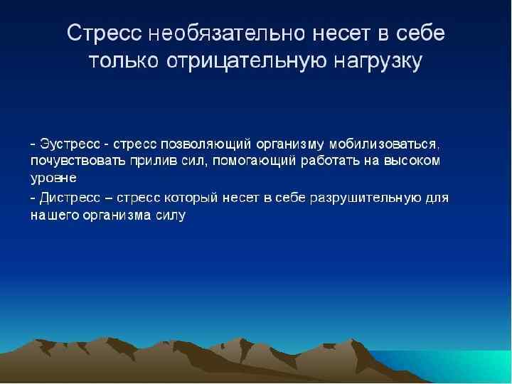 Согласно мнению самого Ганса Селье, стресс может быть и полезным, и в этом случае он «тонизирует» работу организма и способствует мобилизации защитных сил (включая иммунную сис тему). Для того чтобы стресс принял характер эустресса, необходимо наличие определенных условий.