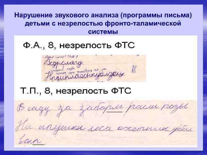 3) В виде трудностей контроля за собственным выполнением § При обучении это может проявляться в том, что ребенок не замечает и не исправляет допущенные ошибки. Часто даже при указании на наличие ошибки, ребенок оказывается неспособным ее найти. В более «мягком» варианте, ребенок замечает и исправляет свои ошибки после того как их совершил, из-за чего возникает грязь в тетради. Незрелость ФТС также проявляется в трудностях усвоения и использования знаковых систем и способов опосредования действий. В результате речь не исполняет свою регулирующую функцию.