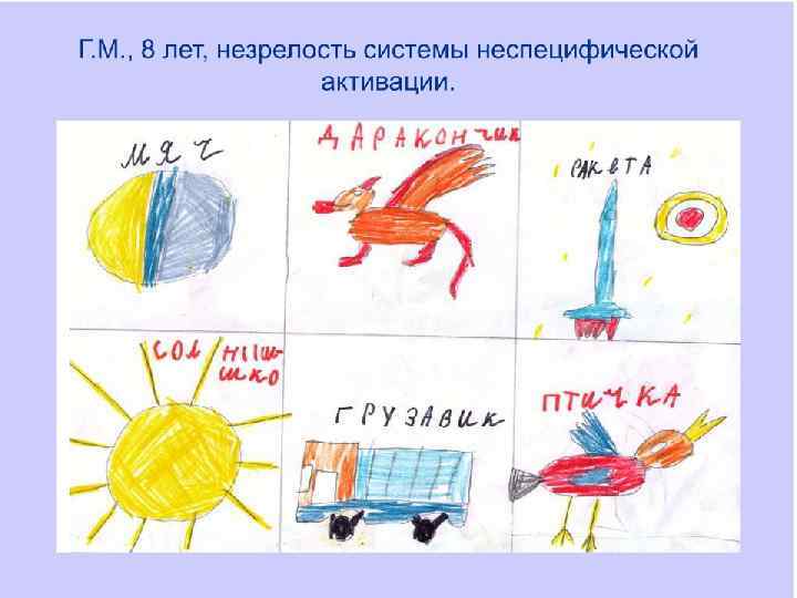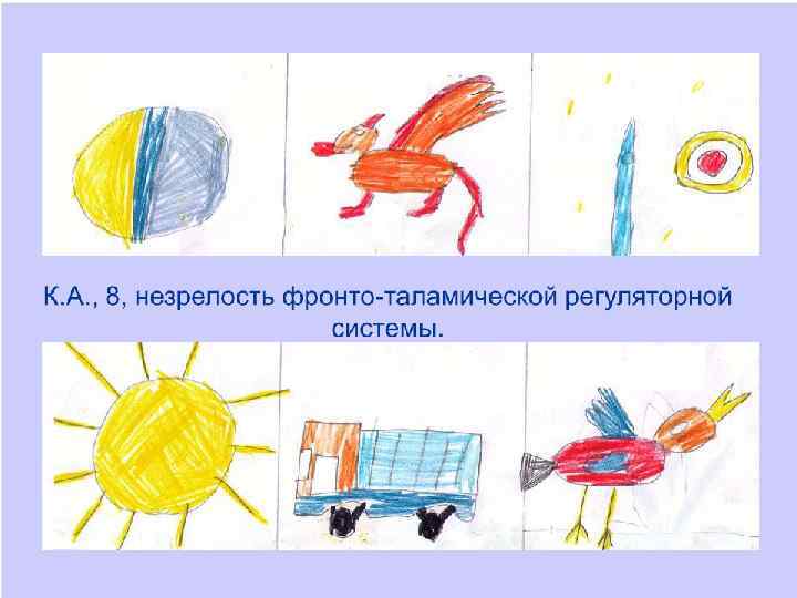Рисунки детей с НФТС § отличаются схематичностью, бедностью существенными для узнавания деталями, высокой степенью отклонений от инструкции (вместо предметов дети рисуют, например, геометрические фигуры).