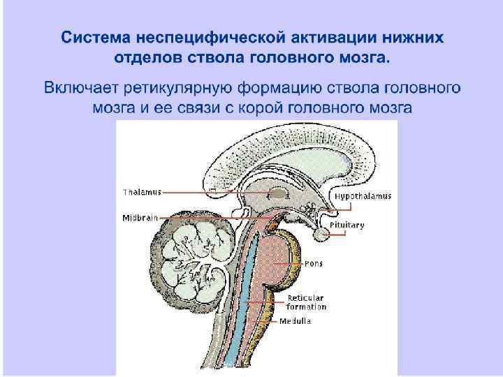 Система неспецифической активации нижних отделов ствола головного мозга § Включает ретикулярную формацию ствола головного мозга и ее связи с корой головного мозга. Обеспечивает общую активацию и поддержание ее устойчивого уровня, регулирует состояния сна и бодрствования, а также нейродинамические характеристики деятельности, такие как: § -темп; § -интенсивность; § -стабильность; § -ритмичность и т. д.