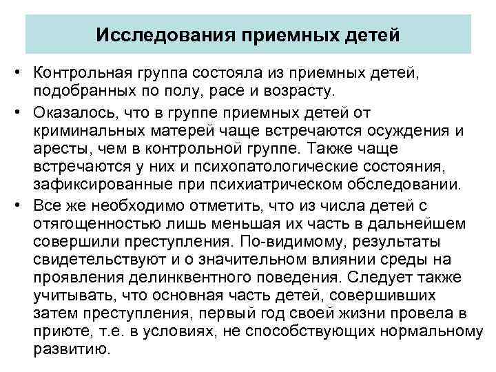 Исследования приемных детей • Контрольная группа состояла из приемных детей, подобранных по полу, расе и возрасту. • Оказалось, что в группе приемных детей от криминальных матерей чаще встречаются осуждения и аресты, чем в контрольной группе. Также чаще встречаются у них и психопатологические состояния, зафиксированные при психиатрическом обследовании. • Все же необходимо отметить, что из числа детей с отягощенностью лишь меньшая их часть в дальнейшем совершили преступления. По-видимому, результаты свидетельствуют и о значительном влиянии среды на проявления делинквентного поведения. Следует также учитывать, что основная часть детей, совершивших затем преступления, первый год своей жизни провела в приюте, т. е. в условиях, не способствующих нормальному развитию.