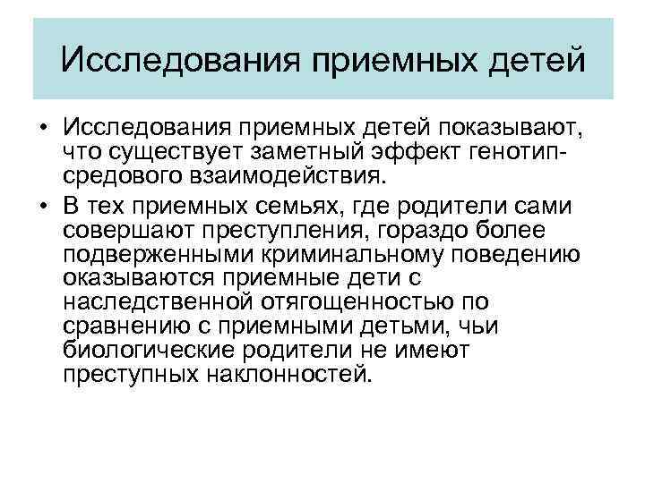 Исследования приемных детей • Исследования приемных детей показывают, что существует заметный эффект генотипсредового взаимодействия. • В тех приемных семьях, где родители сами совершают преступления, гораздо более подверженными криминальному поведению оказываются приемные дети с наследственной отягощенностью по сравнению с приемными детьми, чьи биологические родители не имеют преступных наклонностей.