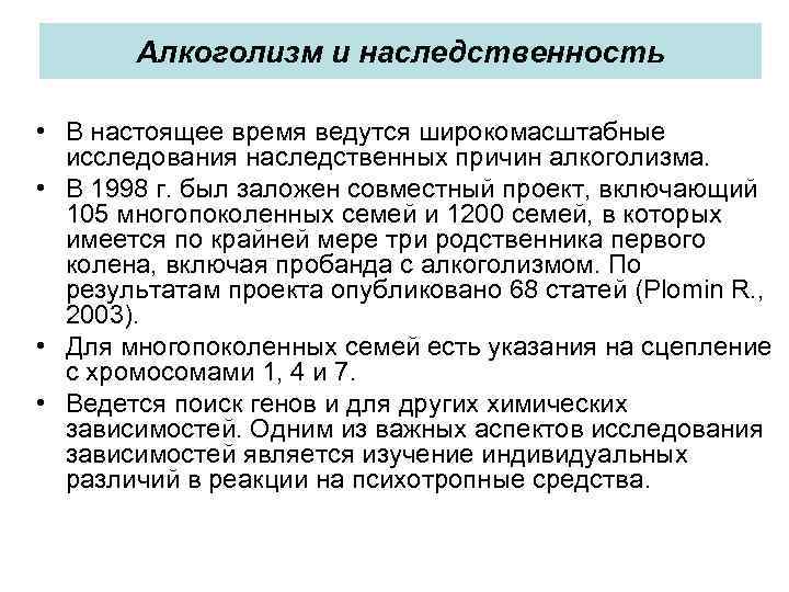 Алкоголизм и наследственность • В настоящее время ведутся широкомасштабные исследования наследственных причин алкоголизма. • В 1998 г. был заложен совместный проект, включающий 105 многопоколенных семей и 1200 семей, в которых имеется по крайней мере три родственника первого колена, включая пробанда с алкоголизмом. По результатам проекта опубликовано 68 статей (Plomin R. , 2003). • Для многопоколенных семей есть указания на сцепление с хромосомами 1, 4 и 7. • Ведется поиск генов и для других химических зависимостей. Одним из важных аспектов исследования зависимостей является изучение индивидуальных различий в реакции на психотропные средства.