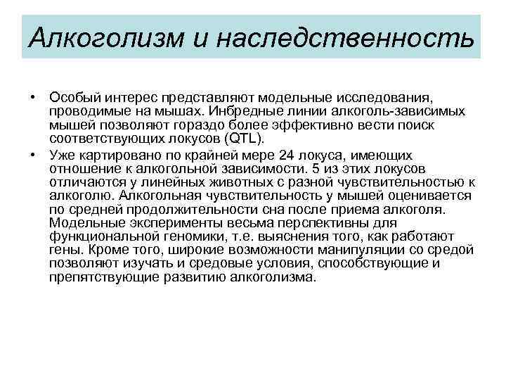 Алкоголизм и наследственность • Особый интерес представляют модельные исследования, проводимые на мышах. Инбредные линии алкоголь-зависимых мышей позволяют гораздо более эффективно вести поиск соответствующих локусов (QTL). • Уже картировано по крайней мере 24 локуса, имеющих отношение к алкогольной зависимости. 5 из этих локусов отличаются у линейных животных с разной чувствительностью к алкоголю. Алкогольная чувствительность у мышей оценивается по средней продолжительности сна после приема алкоголя. Модельные эксперименты весьма перспективны для функциональной геномики, т. е. выяснения того, как работают гены. Кроме того, широкие возможности манипуляции со средой позволяют изучать и средовые условия, способствующие и препятствующие развитию алкоголизма.