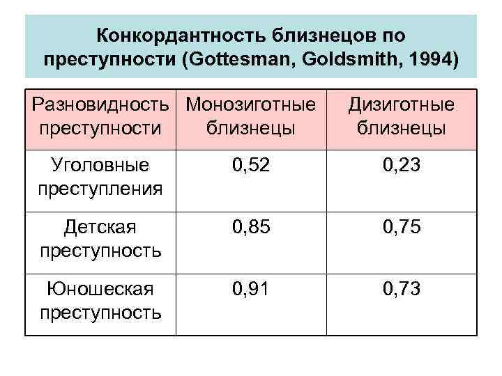 Конкордантность близнецов по преступности (Gottesman, Goldsmith, 1994) Разновидность Монозиготные преступности близнецы Дизиготные близнецы Уголовные преступления 0, 52 0, 23 Детская преступность 0, 85 0, 75 Юношеская преступность 0, 91 0, 73