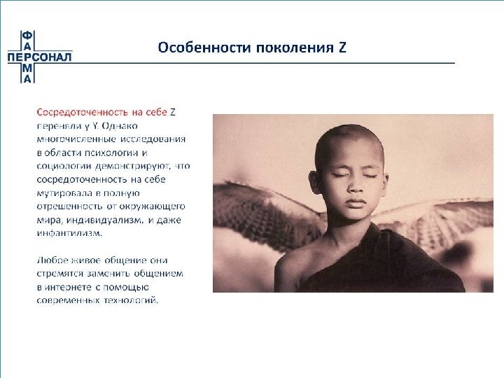 Ценят честность и откровенность Открыты в общении и это часто шокирует людей старшего поколения Отлично работают с информацией Образ мысли отличается фрагментарностью Быстро взрослеют Это поколение опытных потребителей: знают что хотят и что нужно сделать, чтобы это получить