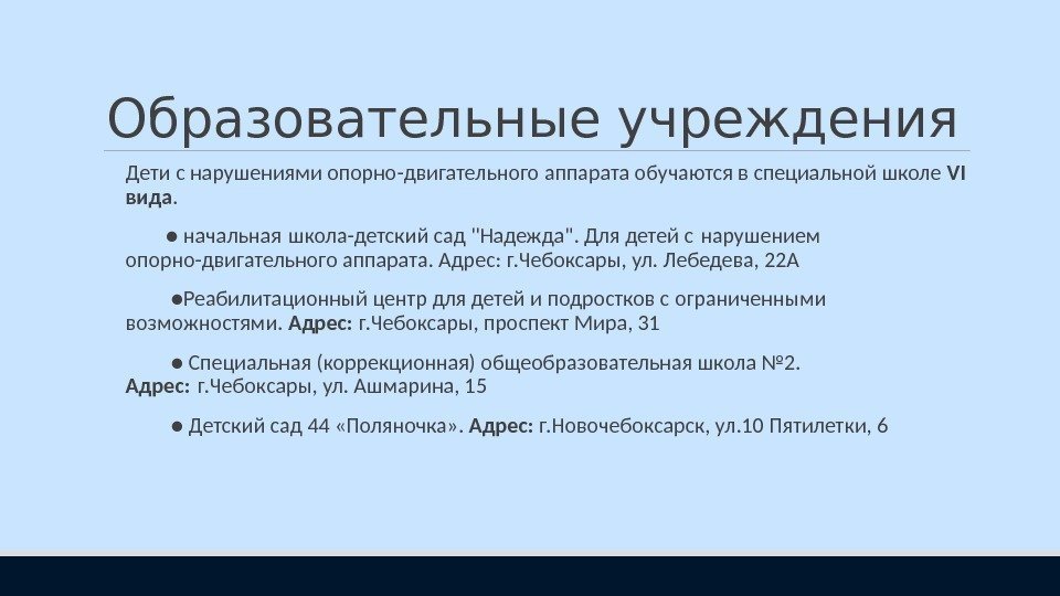 Образовательные учреждения Дети с нарушениями опорно-двигательного аппарата обучаются в специальной школе VI вида. ● начальная школа-детский сад «Надежда». Для детей с нарушением опорно-двигательного аппарата. Адрес: г. Чебоксары, ул. Лебедева, 22 А ● Реабилитационный центр для детей и подростков с ограниченными возможностями. Адрес: г. Чебоксары, проспект Мира, 31 ● Специальная (коррекционная) общеобразовательная школа № 2. Адрес: г. Чебоксары, ул. Ашмарина, 15 ● Детский сад 44 «Поляночка» . Адрес: г. Новочебоксарск, ул. 10 Пятилетки,