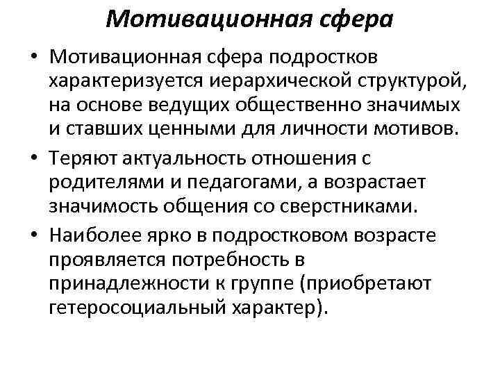 Мотивационная сфера • Мотивационная сфера подростков характеризуется иерархической структурой, на основе ведущих общественно значимых и ставших ценными для личности мотивов. • Теряют актуальность отношения с родителями и педагогами, а возрастает значимость общения со сверстниками. • Наиболее ярко в подростковом возрасте проявляется потребность в принадлежности к группе (приобретают гетеросоциальный характер).