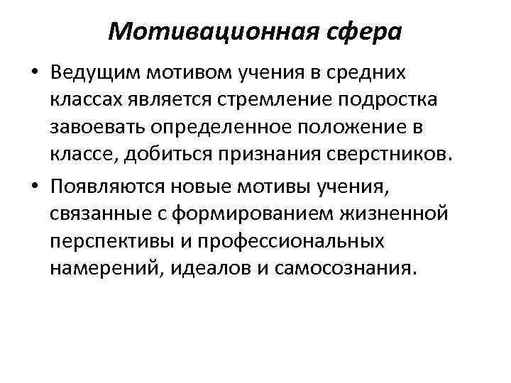 Мотивационная сфера • Ведущим мотивом учения в средних классах является стремление подростка завоевать определенное положение в классе, добиться признания сверстников. • Появляются новые мотивы учения, связанные с формированием жизненной перспективы и профессиональных намерений, идеалов и самосознания.