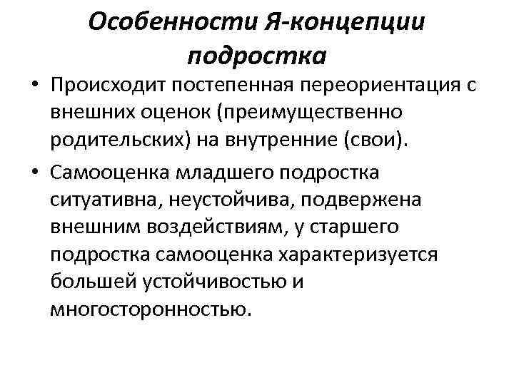 Особенности Я-концепции подростка • Происходит постепенная переориентация с внешних оценок (преимущественно родительских) на внутренние (свои). • Самооценка младшего подростка ситуативна, неустойчива, подвержена внешним воздействиям, у старшего подростка самооценка характеризуется большей устойчивостью и многосторонностью.