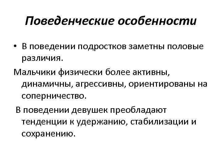Поведенческие особенности • В поведении подростков заметны половые различия. Мальчики физически более активны, динамичны, агрессивны, ориентированы на соперничество. В поведении девушек преобладают тенденции к удержанию, стабилизации и сохранению.