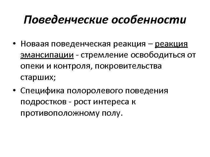 Поведенческие особенности • Новаая поведенческая реакция – реакция эмансипации - стремление освободиться от опеки и контроля, покровительства старших; • Специфика полоролевого поведения подростков - рост интереса к противоположному полу.
