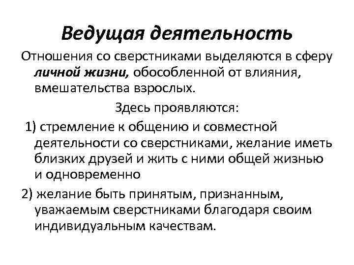 Ведущая деятельность Отношения со сверстниками выделяются в сферу личной жизни, обособленной от влияния, вмешательства взрослых. Здесь проявляются: 1) стремление к общению и совместной деятельности со сверстниками, желание иметь близких друзей и жить с ними общей жизнью и одновременно 2) желание быть принятым, признанным, уважаемым сверстниками благодаря своим индивидуальным качествам.