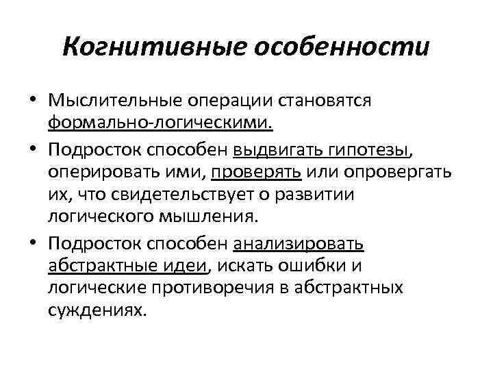 Когнитивные особенности • Мыслительные операции становятся формально-логическими. • Подросток способен выдвигать гипотезы, оперировать ими, проверять или опровергать их, что свидетельствует о развитии логического мышления. • Подросток способен анализировать абстрактные идеи, искать ошибки и логические противоречия в абстрактных суждениях.