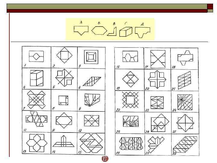 Представление и воображение Цель: исследование пространственного мышления, способности манипулировать геометрическими фигурами в воображении. Материал: VIII субтеста структуры интеллекта Амтхауэра