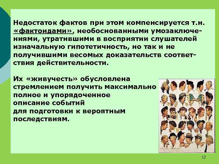Недостаток фактов при этом компенсируется т. н. «фактоидами» , необоснованными умозаключениями, утратившими в восприятии слушателей изначальную гипотетичность, но так и не получившими весомых доказательств соответствия действительности. Их «живучесть» обусловлена стремлением получить максимально полное и упорядоченное описание событий для подготовки к вероятным последствиям. 12