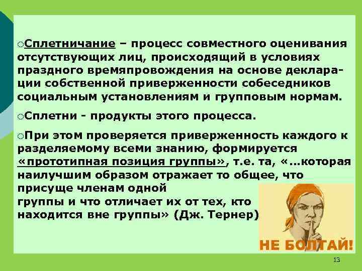 ¡Сплетничание – процесс совместного оценивания отсутствующих лиц, происходящий в условиях праздного времяпровождения на основе декларации собственной приверженности собеседников социальным установлениям и групповым нормам. ¡Сплетни - продукты этого процесса. ¡При этом проверяется приверженность каждого к разделяемому всеми знанию, формируется «прототипная позиция группы» , т. е. та, «…которая наилучшим образом отражает то общее, что присуще членам одной группы и что отличает их от тех, кто находится вне группы» (Дж. Тернер). 13