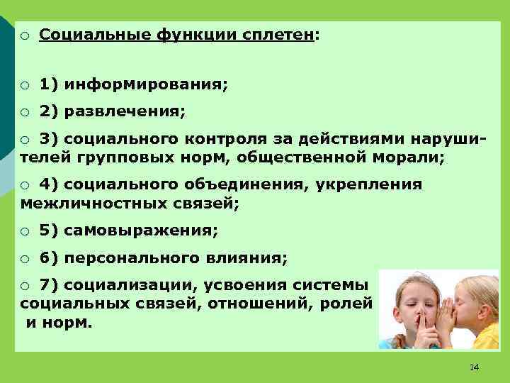 ¡ Социальные функции сплетен: ¡ 1) информирования; ¡ 2) развлечения; 3) социального контроля за действиями нарушителей групповых норм, общественной морали; ¡ 4) социального объединения, укрепления межличностных связей; ¡ ¡ 5) самовыражения; ¡ 6) персонального влияния; 7) социализации, усвоения системы социальных связей, отношений, ролей и норм. ¡ 14