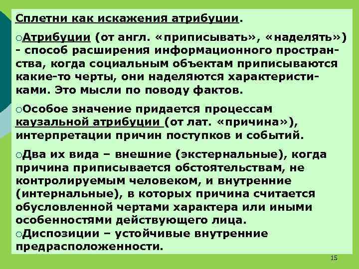 Сплетни как искажения атрибуции. ¡Атрибуции (от англ. «приписывать» , «наделять» ) - способ расширения информационного пространства, когда социальным объектам приписываются какие-то черты, они наделяются характеристиками. Это мысли по поводу фактов. ¡Особое значение придается процессам каузальной атрибуции (от лат. «причина» ), интерпретации причин поступков и событий. ¡Два их вида – внешние (экстернальные), когда причина приписывается обстоятельствам, не контролируемым человеком, и внутренние (интернальные), в которых причина считается обусловленной чертами характера или иными особенностями действующего лица. ¡Диспозиции – устойчивые внутренние предрасположенности. 15
