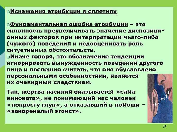 ¡Искажения атрибуции в сплетнях ¡Фундаментальная ошибка атрибуции – это склонность преувеличивать значение диспозиционных факторов при интерпретации чьего-либо (чужого) поведения и недооценивать роль ситуативных обстоятельств. ¡Иначе говоря, это обозначение тенденции игнорировать вынужденность поведения другого лица и поспешно считать, что оно обусловлено персональными особенностями, является их очевидным следствием. Так, жертва насилия оказывается «сама виновата» , не понимающий нас человек «попросту глуп» , а отказавший в помощи – «закоренелый эгоист» . 17