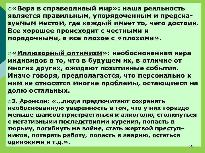 ¡ «Вера в справедливый мир» : наша реальность является правильным, упорядоченным и предсказуемым местом, где каждый имеет то, чего достоин. Все хорошее происходит с честными и порядочными, а все плохое с «плохими» . ¡ «Иллюзорный оптимизм» : необоснованная вера индивидов в то, что в будущем их, в отличие от многих других, ожидают позитивные события. Иначе говоря, предполагается, что персонально к ним не относятся многие проблемы, остающиеся на долю остальных. ¡Э. Аронсон: «…люди предпочитают сохранять необоснованную уверенность в том, что у них гораздо меньше шансов пристраститься к алкоголю, столкнуться с негативными последствиями курения, попасть в тюрьму, погибнуть на войне, стать жертвой преступников, потерять работу, попасть в аварию, остаться одинокими и т. д. » . 18