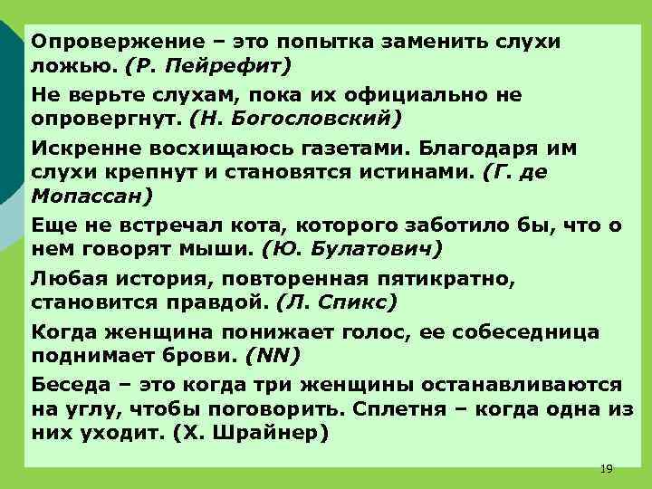 Опровержение – это попытка заменить слухи ложью. (Р. Пейрефит) Не верьте слухам, пока их официально не опровергнут. (Н. Богословский) Искренне восхищаюсь газетами. Благодаря им слухи крепнут и становятся истинами. (Г. де Мопассан) Еще не встречал кота, которого заботило бы, что о нем говорят мыши. (Ю. Булатович) Любая история, повторенная пятикратно, становится правдой. (Л. Спикс) Когда женщина понижает голос, ее собеседница поднимает брови. (NN) Беседа – это когда три женщины останавливаются на углу, чтобы поговорить. Сплетня – когда одна из них уходит. (Х. Шрайнер) 19