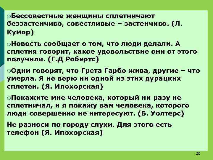 ¡Бессовестные женщины сплетничают беззастенчиво, совестливые – застенчиво. (Л. Кумор) ¡Новость сообщает о том, что люди делали. А сплетня говорит, какое удовольствие они от этого получили. (Г. Д Робертс) ¡Одни говорят, что Грета Гарбо жива, другие – что умерла. Я не верю ни одной из этих дурацких сплетен. (Я. Ипохорская) ¡Покажите мне человека, который ни разу не сплетничал, и я покажу вам человека, которого люди совершенно не интересуют. (Б. Уолтерс) Не разноси по городу слухи. Для этого есть телефон (Я. Ипохорская) 20