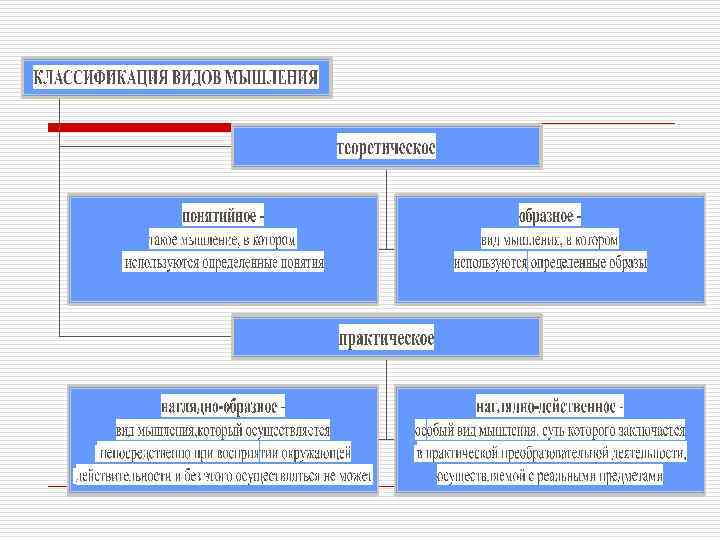 Классификация мышления (виды мышления) по форме нагляднодейственное конкретнообразное абстрактнологическое по характеру решаемых задач теоретическое практическое по степени новизны и оригинальности репродуктивное (воспроизводящее) продуктивное (творческое)