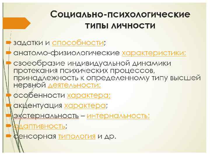 Социально-психологические особенности личности • задатки и способности; • анатомо-физиологические характеристики; • своеобразие индивидуальной динамики протекания психических процессов, принадлежность к определенному типу высшей нервной деятельности; • особенности характера; • акцентуация характера (клинические типологии); • экстернальность – интернальность; • адаптивность; • сенсорная типология и др. (Как рассадить детей в классе)