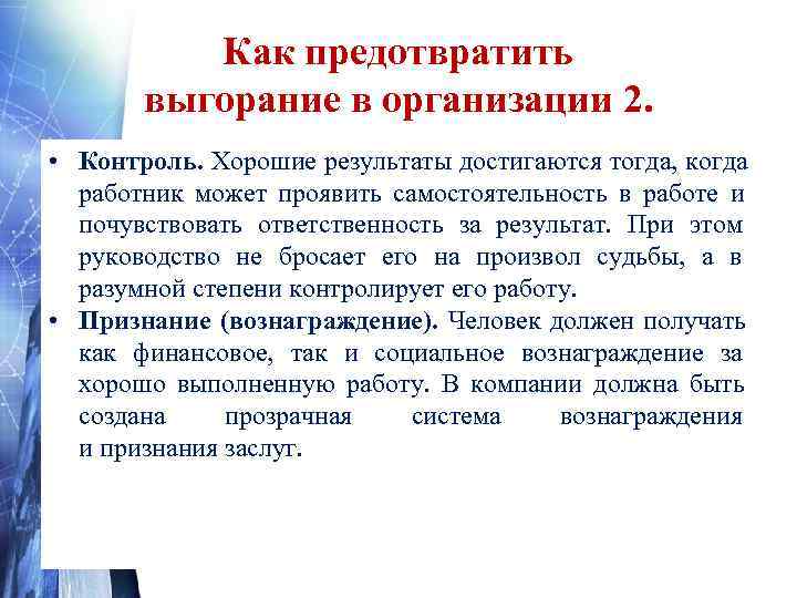 Как предотвратить выгорание в организации 2. • Контроль. Хорошие результаты достигаются тогда, когда работник может проявить самостоятельность в работе и почувствовать ответственность за результат. При этом руководство не бросает его на произвол судьбы, а в разумной степени контролирует его работу. • Признание (вознаграждение). Человек должен получать как финансовое, так и социальное вознаграждение за хорошо выполненную работу. В компании должна быть создана прозрачная система вознаграждения и признания заслуг.