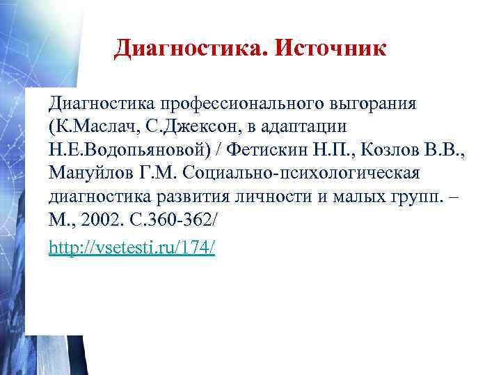 Диагностика. Источник Диагностика профессионального выгорания (К. Маслач, С. Джексон, в адаптации Н. Е. Водопьяновой) / Фетискин Н. П. , Козлов В. В. , Мануйлов Г. М. Социально-психологическая диагностика развития личности и малых групп. – М. , 2002. C. 360 -362/ http: //vsetesti. ru/174/