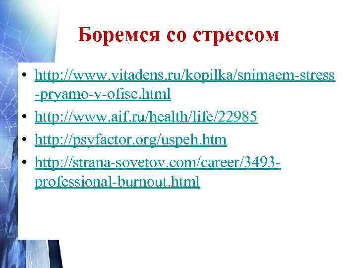 Боремся со стрессом • http: //www. vitadens. ru/kopilka/snimaem-stress -pryamo-v-ofise. html • http: //www. aif. ru/health/life/22985 • http: //psyfactor. org/uspeh. htm • http: //strana-sovetov. com/career/3493 - professional-burnout. html