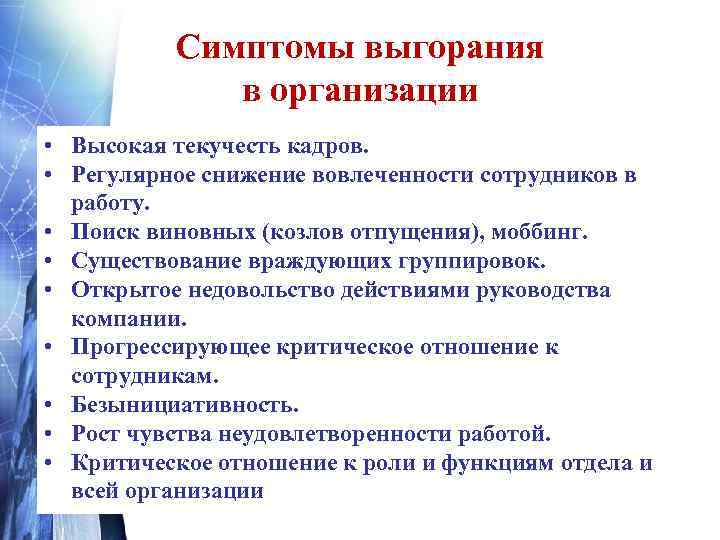 Симптомы выгорания в организации • Высокая текучесть кадров. • Регулярное снижение вовлеченности сотрудников в работу. • Поиск виновных (козлов отпущения), моббинг. • Существование враждующих группировок. • Открытое недовольство действиями руководства компании. • Прогрессирующее критическое отношение к сотрудникам. • Безынициативность. • Рост чувства неудовлетворенности работой. • Критическое отношение к роли и функциям отдела и всей организации