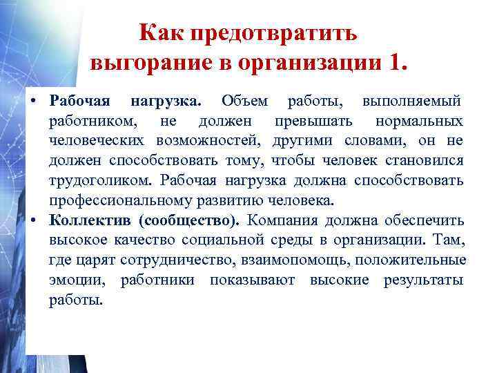 Как предотвратить выгорание в организации 1. • Рабочая нагрузка. Объем работы, выполняемый работником, не должен превышать нормальных человеческих возможностей, другими словами, он не должен способствовать тому, чтобы человек становился трудоголиком. Рабочая нагрузка должна способствовать профессиональному развитию человека. • Коллектив (сообщество). Компания должна обеспечить высокое качество социальной среды в организации. Там, где царят сотрудничество, взаимопомощь, положительные эмоции, работники показывают высокие результаты работы.