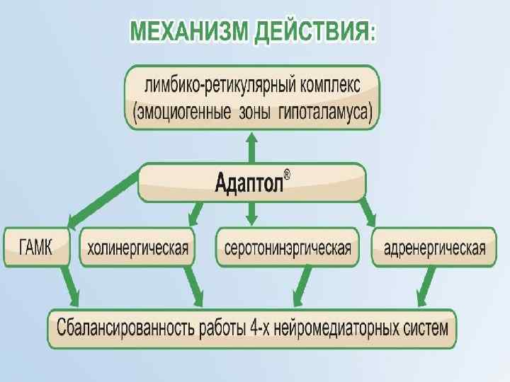 ДЕЙСТВИЕ АДАПТОЛА НА ОРГАНИЗМ. § Соматотропное – кардиопротектор ( снижение симпатикотонии, увеличение коронарного кровотока и сократимости миокарда, улучшение микроциркуляции). § Противотревожное - уменьшение тревоги, страха, эмоциональной лабильности, раздражительности, навязчивостей. § Вегетостабилизирующее - уменьшение нейровегетативных проявлений тревоги, пароксизмов, диэнцефальных кризов. § Стресс-протективное –профилактика и защита от усталости, перегрузок и переутомления у здоровых. § Ноотропное – улучшение памяти, внимания, настроения. § Нормализация состояния при психосоматических расстройствах – кардиалгии, БА , бронхиты, ЯБ, гастриты, ангины.