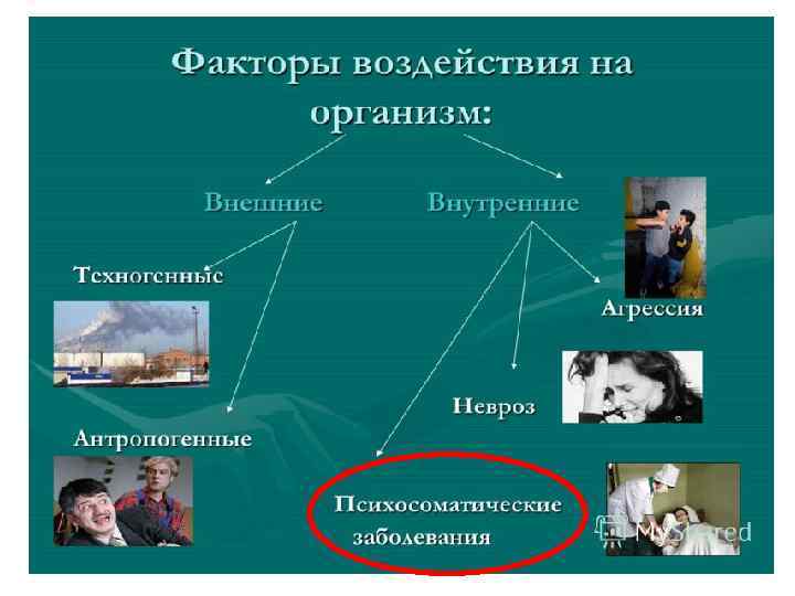 ПСИХОСОМАТИЧЕСКИЕ ЗАБОЛЕВАНИЯ • Психосомати ческие заболева ния (от др. -греч. ψυχή — душа и σῶμα — тело) — группа болезненных состояний, появляющихся в результате взаимодействия психических и физиологических факторов. • Представляют собой психические расстройства, проявляющиеся на физиологическом уровне, физиологические расстройства, проявляющиеся на психическом уровне, или физиологические патологии, развивающиеся под влиянием психогенных факторов.