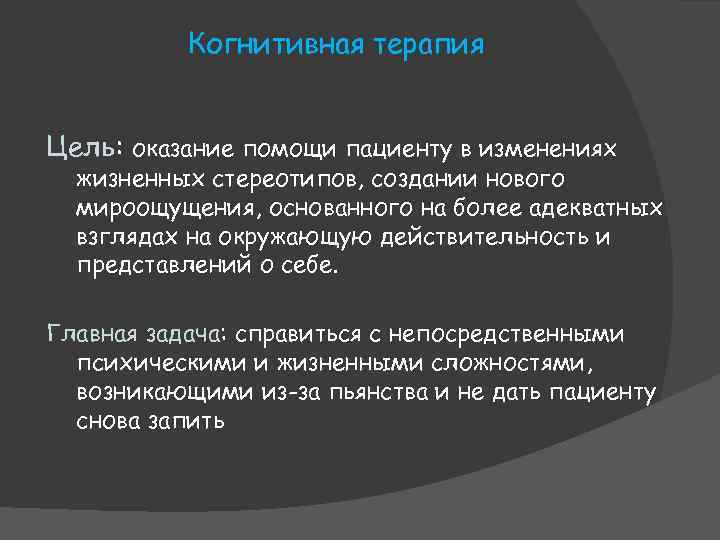 Когнитивная терапия Цель: оказание помощи пациенту в изменениях жизненных стереотипов, создании нового мироощущения, основанного на более адекватных взглядах на окружающую действительность и представлений о себе. Главная задача: справиться с непосредственными психическими и жизненными сложностями, возникающими из-за пьянства и не дать пациенту снова запить