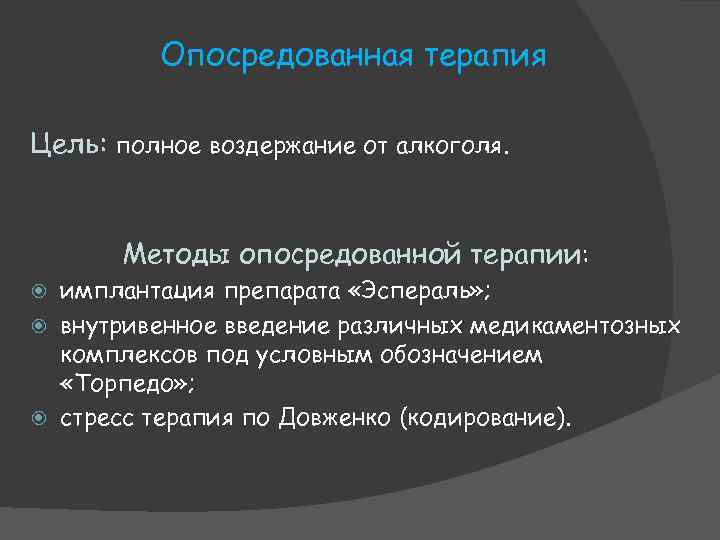 Опосредованная терапия Цель: полное воздержание от алкоголя. Методы опосредованной терапии: имплантация препарата «Эспераль» ; внутривенное введение различных медикаментозных комплексов под условным обозначением «Торпедо» ; стресс терапия по Довженко (кодирование).