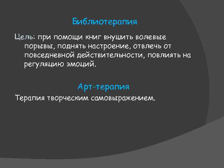 Библиотерапия Цель: при помощи книг внушить волевые порывы, поднять настроение, отвлечь от повседневной действительности, повлиять на регуляцию эмоций. Арт-терапия Терапия творческим самовыражением.