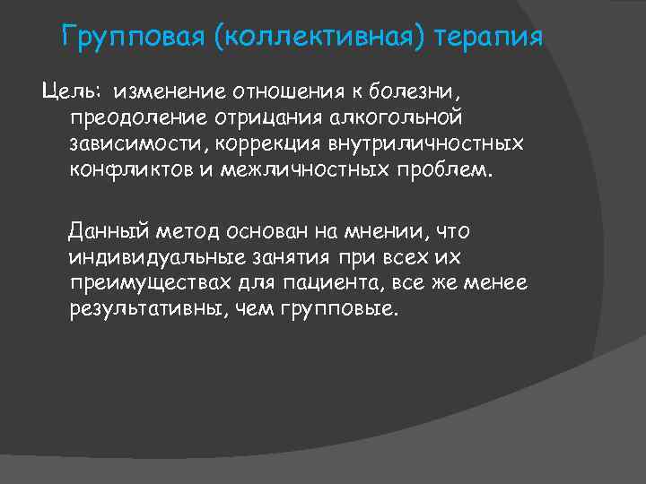 Групповая (коллективная) терапия Цель: изменение отношения к болезни, преодоление отрицания алкогольной зависимости, коррекция внутриличностных конфликтов и межличностных проблем. Данный метод основан на мнении, что индивидуальные занятия при всех их преимуществах для пациента, все же менее результативны, чем групповые.