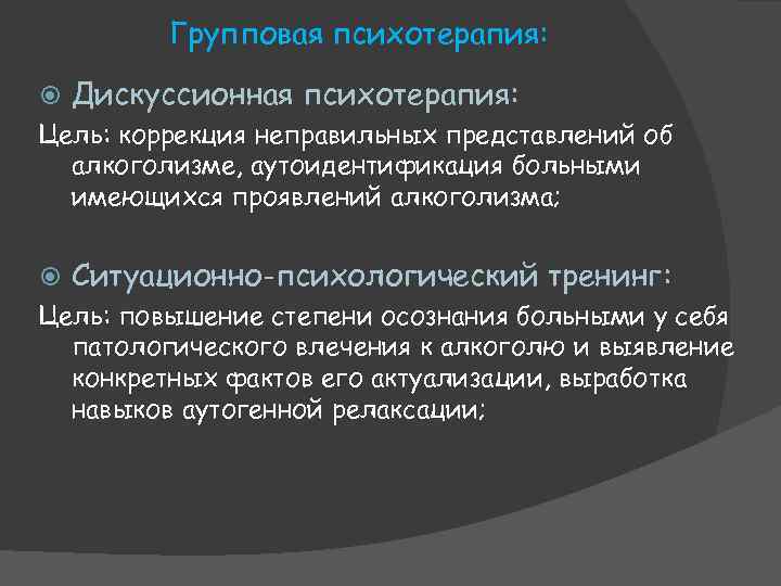 Групповая психотерапия: Дискуссионная психотерапия: Цель: коррекция неправильных представлений об алкоголизме, аутоидентификация больными имеющихся проявлений алкоголизма; Ситуационно-психологический тренинг: Цель: повышение степени осознания больными у себя патологического влечения к алкоголю и выявление конкретных фактов его актуализации, выработка навыков аутогенной релаксации;