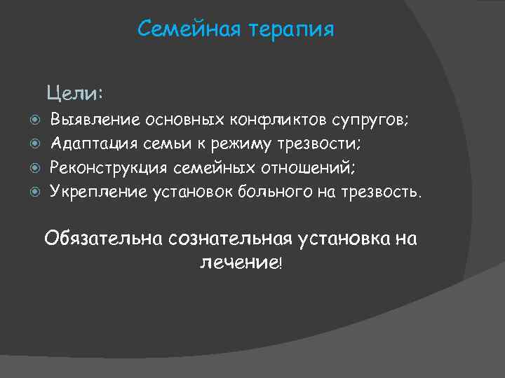 Семейная терапия Цели: Выявление основных конфликтов супругов; Адаптация семьи к режиму трезвости; Реконструкция семейных отношений; Укрепление установок больного на трезвость. Обязательна сознательная установка на лечение!